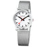 特徴は、たった6.2mmという薄いケースと、どんなサイズの腕元にも合うようにフラットに設計されたラグ。1986年から変わらない、スイス国鉄オフィシャルウォッチのデザインを落とし込んだ、モンディーンならではのフェイスはそのまま。